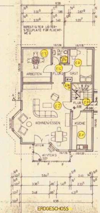Küche (E1), Wohnzimmer mit Kamin (E2), Arbeiten (E3), Dusche u. WC (E4),