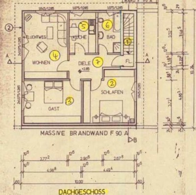 (2), Gast (3), Wohnen (4), Küche (5), Bad (6) und Diele (7).